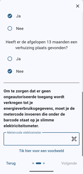 En vul je metercode in, of scan de code door op het kleine QR-icoontje te tikken:
